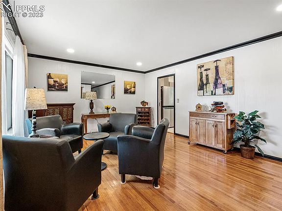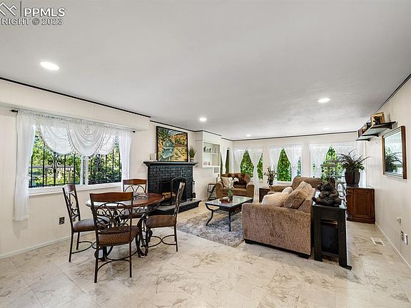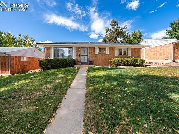 Welcome to this all brick rancher nestled within a tranquil tree lined neighborhood with Pikes Peak views! This home exudes character and warmth. As you enter, you are greeted by beautiful hardwood floors that run throughout the living room and bedrooms. The bright, well-appointed and updated kitchen features a gas range and ample counter and cabinet space. Adjacent to the kitchen, you'll find the unique and wonderful great room that provides a welcoming space to gather, complete with dining area, abundant natural light and a show stopping wood fireplace. There are 3 bedrooms and remodeled bathroom, complete with jet tub, also on the main floor. The basement rec room has been transformed into a spacious master suite. The zero-entry shower has been designed for ultimate convenience and ease of use. Say goodbye to the hassle of grout maintenance – the seamless design makes cleaning a breeze! This home low maintenance with all solid surface flooring and no carpet has been meticulously maintained and recent upgrades include a new roof, new sewer line, all new interior paint, a gas line to the stove, new electrical box, and recessed lighting. The home also features an oversized 1.5 car garage, providing plenty of room for parking and additional storage. Located in a quiet neighborhood, this sunny home is just down the street from Palmer Park and stellar hiking trails. Conveniently close to amenities, schools, parks, and only 7 minutes to downtown! Low taxes and no HOA! Don't miss the chance to make this property your own!