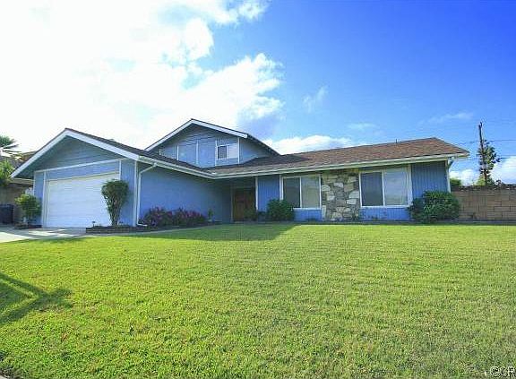 WELL MAINTAINED 5 BEDROOM POOL HOME! Great location in a quiet Glendora neighborhood with a landscaped front yard with a lush lawn, brick planters and a two car garage. The front walkway leads to a covered front porch with double door entry. Entryway opens to a living room with carpet and a stone fireplace. The kitchen is clean and features linoleum flooring, sturdy cabinets, vintage appliances, spacious countertops, a breakfast bar and a sink with a view of the backyard and pool. The kitchen is open to the family room which offers carpet floors, plenty of wall space and a slider to the back patio and backyard. Master bedroom with a master bathroom which offers a spacious vanity, shower with enclosure and a window. There are two other bedrooms downstairs that share the downstairs hall bathroom. Upstairs there are two more spacious bedrooms that share a Jack and Jill bathroom. The big backyard features a swimming pool with a full safety gate, a large grass yard, mature landscaping, planters, a covered patio and a huge side yard that could potentially accommodate an RV.