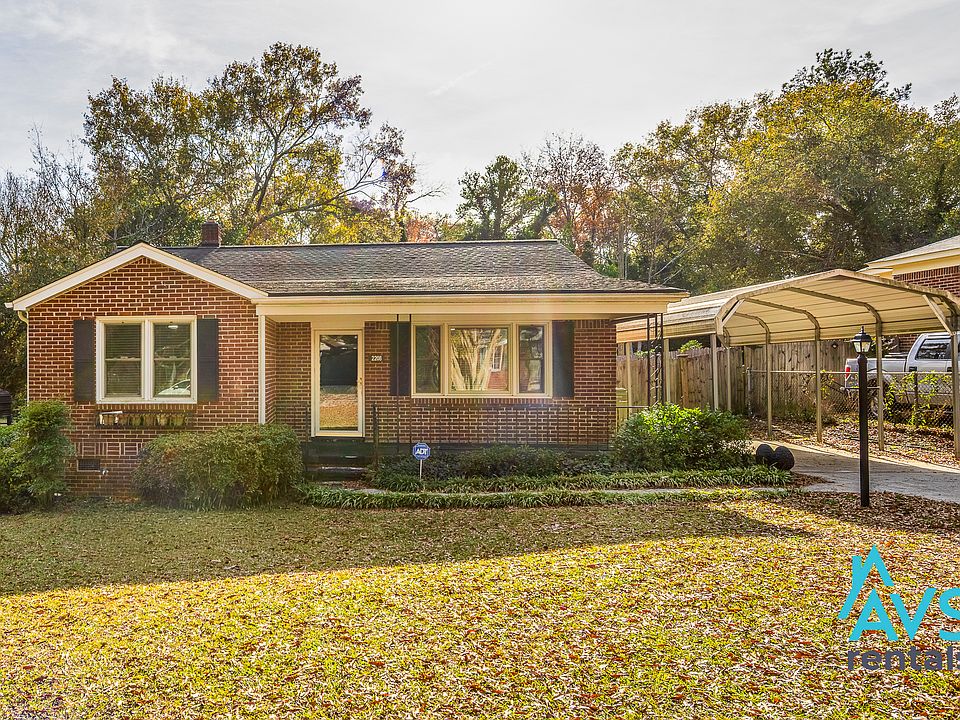 This all brick bungalow has fresh wall paint, new carpet, and new granite countertops! Covered front porch. Living room with plank floors. Eat in kitchen has a comfy feel with plank floors, green beadboard, beautiful wall paper, real wood cabinets, new granite countertops, fridge, stove, microwave, and pantry. Three spacious bedrooms with new ceiling fans, new carpet, and ample closet space. Hall bathroom has a pedestal sink and shower. Enclosed porch has washer and dryer connections. Large partially fenced backyard has a deck perfect for enjoying our South Carolina nights. Off street parking with driveway. Central HVAC. No interior smoking. No pets please. Available Now!