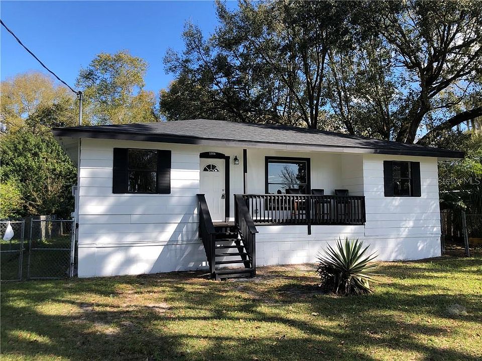 Great 3 bedroom 1 bathroom starter home with a NEW roof, NEW window units, freshly painted inside and out, NEW kitchen counter tops, NEW bathroom vanity unit, NEW fixtures and NEWLY rewired. As you enter the home, you come into the spacious living room filled with light and a view of Lake Blue in front. From this room come the bedrooms and shared bathroom. To the right of the living area is the dining room which leads on to the kitchen. The kitchen leads out to the very large fenced back yard which also has a shed for all your lawn equipment. Sit out on the front porch to take in the fabulous views of Lake Blue. Also in front by the lake is a County Park with playground equipment. Pets will be considered with a Pet Screening Application and Owner Approval.