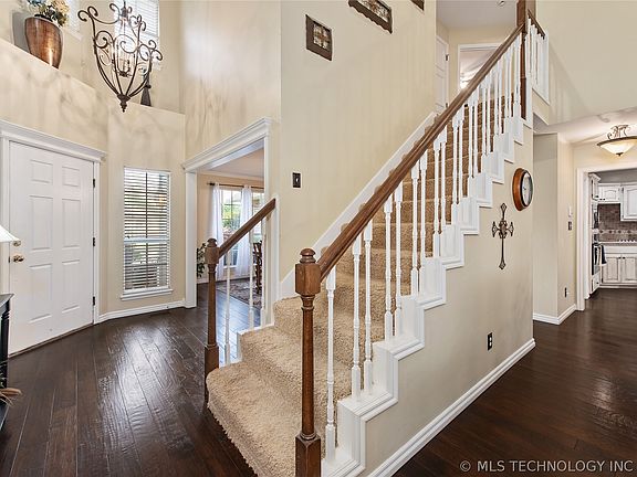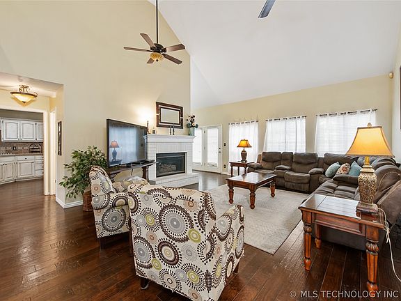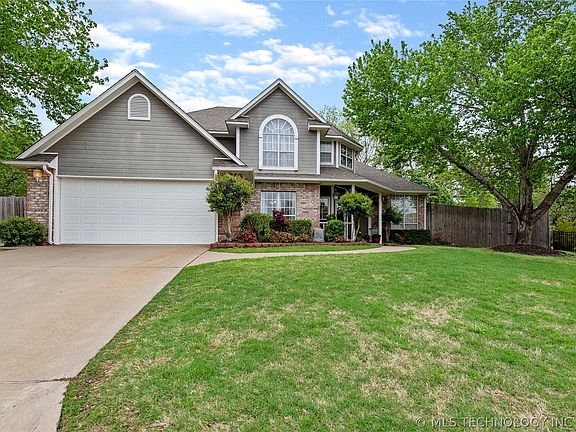 Beautiful two-story, 4 bed/2.5 bath home on a quiet cul-de-sac, close to Muskogee Golf Club. Oversized master down & 3 bedrooms up. Large living room with gas fireplace & 17' vaulted ceiling, wood floors. Eat in kitchen with breakfast nook, bar, built-in stainless appliances and new dishwasher. Formal dining could be used as an office. Sprinkler system, security system and more!