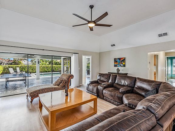 Lowest price single-family pool home in prestigious Imperial Golf Estates! This immaculately maintained and spacious three-bedroom, two-bath residence spans 2,204 square feet and offers a host of modern updates, including new LG stainless kitchen appliances, a new water heater, a new LG washer and dryer, a new pool pump, and a newer HVAC system, all under a durable 2019 roof. Step through the double-door entry into a welcoming foyer with a unique tile and laminate wood parquet floor design, which flows seamlessly into the open living room. Here, 11-foot tray ceilings and a pocketing glass slider invite you to enjoy the lanai, filling the space with natural light. The adjacent formal dining area boasts a designer chandelier and a charming window view. The kitchen is a culinary dream, featuring new LG stainless appliances, wood cabinets, a pantry, a tray ceiling adorned with crown molding, a two-seater breakfast bar, and a casual dining nook with picturesque pool views. The adjoining family room is designed for relaxation and entertainment, complete with a modern ceiling fan, in-ceiling speakers and two glass sliders that open to serene outdoor vistas. Step outside to a large, covered lanai with stamped concrete flooring, offering ample space for dining, lounging and game tables. Beyond, a lush privacy hedge wraps around the sparkling pool, creating your private oasis. The owner's suite is a tranquil retreat with abundant natural light from two windows and a glass slider, a spacious walk-in closet and an en-suite bath featuring a porcelain tile floor, dual sink vanity, a walk-in shower and a linen closet. The two guest bedrooms are generously sized and share a full bath with a shower and tub combination. Additional conveniences include a laundry room with extra cabinet and closet storage, and a secondary refrigerator and beverage cooler in the two-car garage. In sought-after Imperial Golf Estates, a gated community with two 18-hole championship golf courses, a 32,000-square-foot clubhouse, casual and fine dining options, a fitness center, a resort-style pool and spa, tennis courts, and miles of recreational and biking paths. Beyond the gates, you're just seven minutes to the beach, the vibrant shopping and dining of Mercato, and just 1.5 miles of highly rated elementary, middle and high schools, making school drop-off and pickups a breeze. This home is a rare find, combining modern upgrades with an unbeatable location. Your dream Naples lifestyle awaits!
