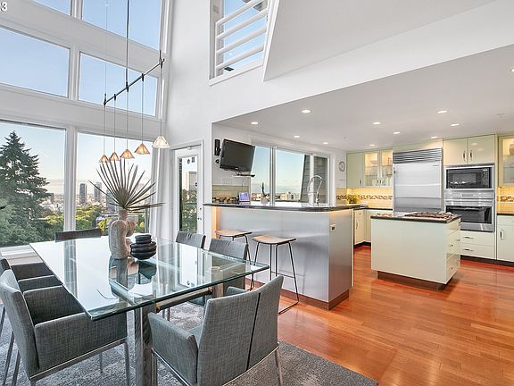 Perched above the city, your opportunity for contemporary luxury living awaits. Only minutes from Downtown Portland, you can enjoy all of the wonderful amenities the city has to offer, but also be able to retreat back home to privacy and breathtaking mountain, river, and city views. Only one of ten units, this condo lives like a townhome with an individual attached garage, two-car driveway, its own private elevator that serves each floor, and an additional 500sqft of storage space in the basement. This exceptional residence boasts an array of features, including skylights and floor-to-ceiling windows that bathe the interior in natural light, a sauna for relaxation, and an expansive primary suite adorned with Calacatta marble. Seller carried financing available! [Home Energy Score = 5. HES Report at https://rpt.greenbuildingregistry.com/hes/OR10191853]