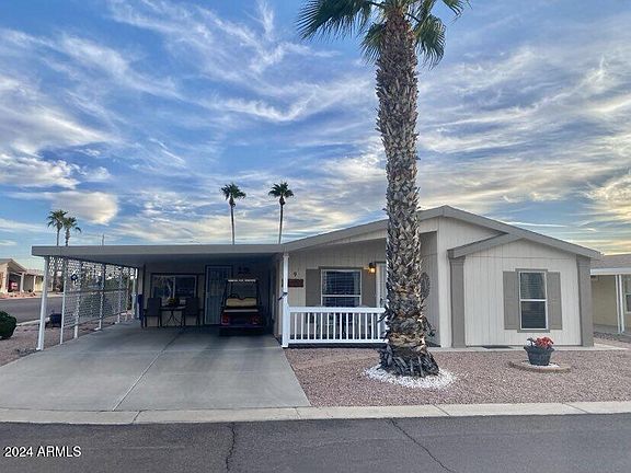 Step inside this charming 2002 CAVCO 3 bed, 2 bath with an added room that acts as a 2nd living room. Features wood colored laminate wood floors, carpet in all the bedrooms and high ceilings. Bright and airy living room, spacious primary bedroom that has a separate walk-in shower with 2 separate closets. The large laundry room includes a washer/dryer for your convenience and a little workshop. The kitchen features all appliances included. The carport is large enough to park a full-sized truck or two cars. The covered patio on the back side of the home is great for entertaining or just relaxing outdoors. The front porch is also nice for relaxing on a beautiful AZ day! This home is turn-key ready for move in. COMES FULLY FURNISHED WITH A GOLF CART AS WELL!