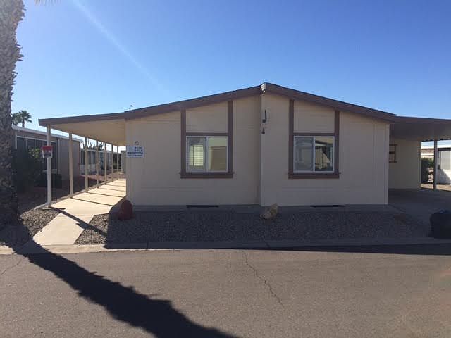 This large open home has a spacious living room that flows from the dining and kitchen area. Perfect for entertaining! The large South Patio has a shed and is connected to the side by side parking. The large shed has electric, shelves and a refrigerator! There is also a mature grapefruit tree! The East patio has a Superstition Mountain view and the entryway into this beautiful, bright home! The home comes with furniture! There is a dormer in the living room and a skylight in the kitchen. This kitchen will make any chef happy with lots of counter space, breakfast bar, stove, refrigerator, microwave, garbage disposal and dishwasher. Washer (new as of February 2016) and Dryer are located in their own space. This is an all electric home with ceiling fans. One in each bedroom and one in living area. The master suite is a spacious room that would easily fit a king (there is a queen size bed now). Large bathroom with a walk in shower. The first guest room has a queen size bed and is right by the guest bathroom. The guest bathroom has a tub/shower. The third bedroom is just waiting for you to decorate! All window treatments are staying. The roof was sprayed/maintained in 2013. It is just waiting for you to enjoy! Call today to set a time to tour your next home! All you need is your suitcase! This home is located in an active 55+ gated,community. Enjoy the resort style pool, shuffleboard, library, clubhouse, organized events and so much more! EHO, certain restrictions may apply.