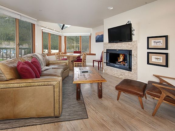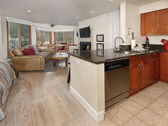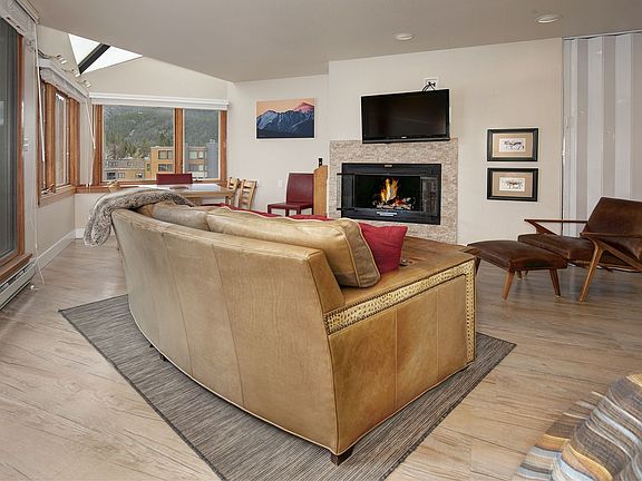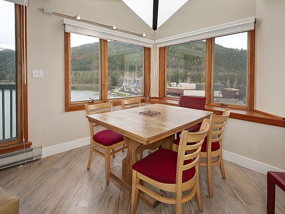 Top-floor studio with skylight and south exposure on Keystone Lake. Big views. Remodeled with new flooring, fireplace surround, cherry cabinets, granite, stainless. Features two queen-sized beds with partitioned separation. Gas fireplace, built-ins, covered deck. Great rental property. Use of Keystone Lodge pool, hot tub, steam, sauna, and exercise room (best in Keystone). Able to walk to Keystone Lodge pool and restaurants without going outside. Pet friendly for owners. Shuttle to ski base.