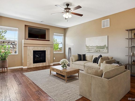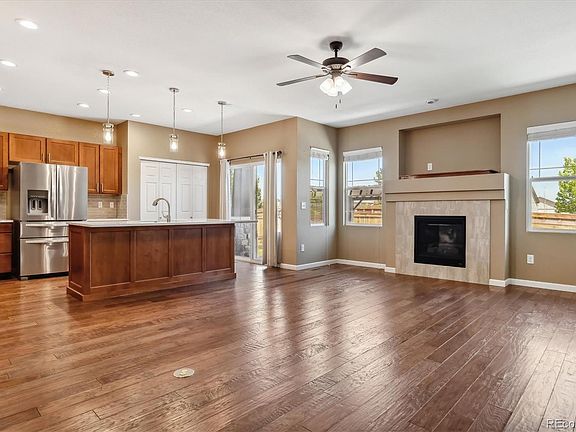 Live in the heart of sought-after Copperleaf at 22083 E Grand Drive, offering contemporary indoor/outdoor living in an updated ranch floorplan. All new exterior paint, gutters, and a covered front porch invite you in from the street while beautiful, engineered hardwood floors, a neutral palette, high ceilings and tons of natural light greet you upon entry and unfold to an open main living area. The gas fireplace is a focal point to the spacious family room, seamlessly connecting to the well-appointed remodeled kitchen. Enjoy preparing a meal or entertaining guests at the oversized center island with quartz counters, ample 42” soft-close cabinetry and pull-out drawers, tile backsplash, a large pantry, and a stainless steel appliance package. Step out the large glass slider to an entertainer’s patio. The huge stamped concrete patio includes a 16x12’ metal pergola that is both rust and UV-resistant for longevity to enjoy for years ahead. A zero-maintenance turf lawn and professional landscaping complete the outdoor space. Retreat to your primary suite, including a walk-in closet and updated 4-piece bath. Additional features of this home include new carpet, two large, main-floor secondary bedrooms, a spacious framed-in basement ready for you to make your own or use for additional storage, and a 2-car finished garage. The Copperleaf community includes a community pool, clubhouse, and is moments from Western Park that hosts weekly Food Trucks and neighborhood events in the summer months. Saddle Rock Golf Course, Southlands Mall, shopping, dining, and more are just minute's drive. 22083 E Grand Dr truly has it all and will not last long. Book your showing today and live in the heart of all that Copperleaf has to offer!
