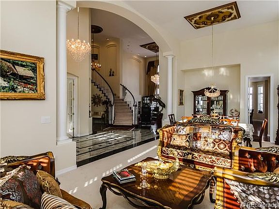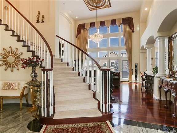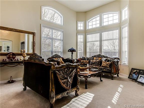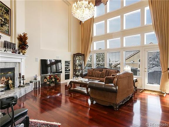Luxurious upgraded home over 4300 finished sq feet 7300 total sq feet. One of the largest lots in Saddle Rock North. 3 bedrooms up plus a large main floor master with fireplace, sitting area and 5 piece bath. Soaring vaulted ceilings, plenty of natural light, open and spacious floorplan. Marble entry and hardwoods throughout the main level. Floor to ceiling windows in living room. Main floor office. Gourmet kitchen upgraded with slab granite, island with a gas cooktop and double oven. Butler pantry leads to formal dining and sitting areas. Large deck perfect for entertaining. Beautifully finished backyard with water feature and 110 foot stream leading to a pond. Custom Iron fence and two Iron gates provide a fully fenced backyard. Mountain and city views. Three car garage. Walkout basement with high ceilings ready to be finished. Excellent Cherry Creek Schools. Close to golf course, shopping and dining. Great opportunity!
