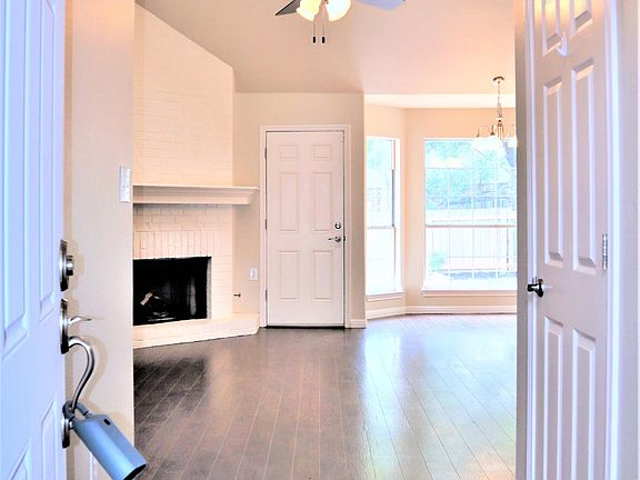 Single story home with an open floor plan and laminate flooring and tile throughout, no carpet! The living room features a cozy brick fireplace, vaulted ceilings, and built-in shelves. The living room leads you into the adorable breakfast nook framed by a large bay window overlooking the backyard. The kitchen features white cabinets, stainless steel appliances, a pantry, and a lovely window over the sink. The large backyard has beautiful trees and planter boxes that are perfect for your vegetable garden! All of the bedrooms have natural light pouring in through the large windows. Both bathrooms are updated and have ample counter space and storage. Plus there is also a separate laundry room. The garage has plenty of built in cabinetry allowing for organized projects and tools. This is a wonderful residential pocket with community pools and a park. Convenient location for business, shopping, and recreation, with great RRISD schools. Owner is a licensed Texas Realtor $500 pet deposit $50 pet rent