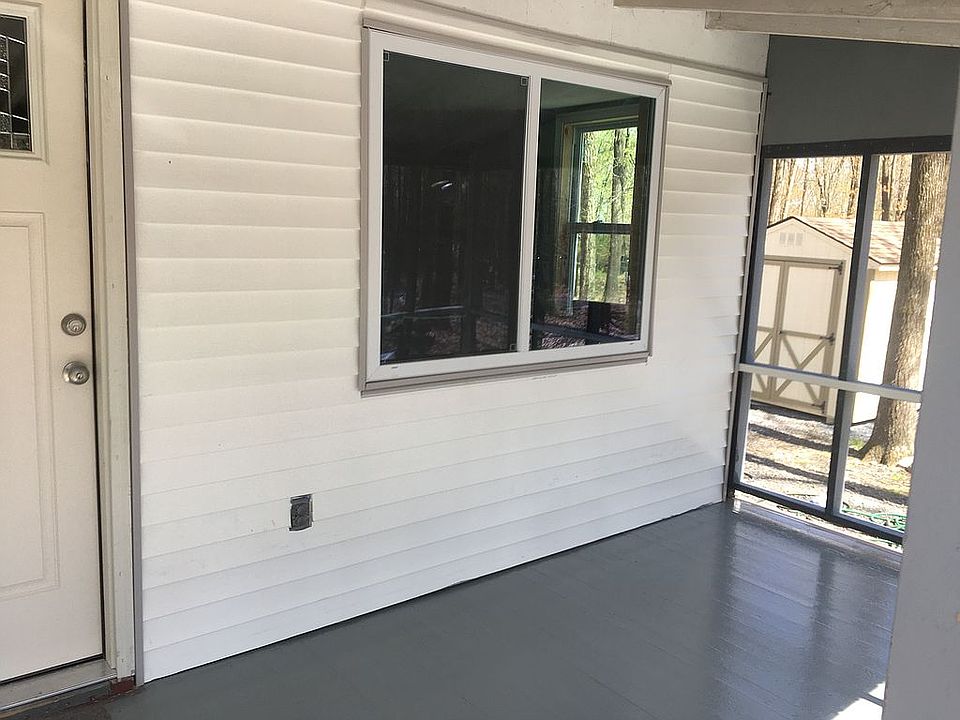 - ExteriorFeatures: Porch - Screened, Porch, Storm Door, Wood Siding