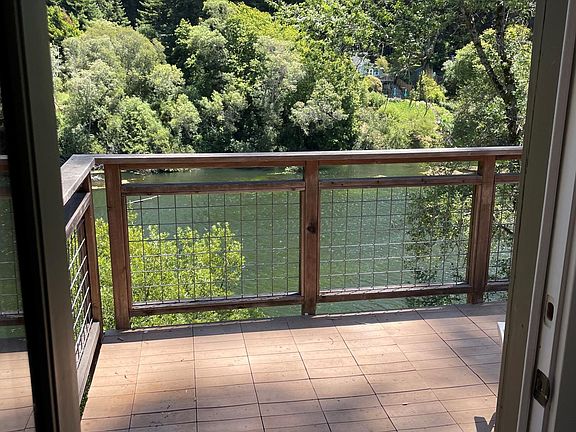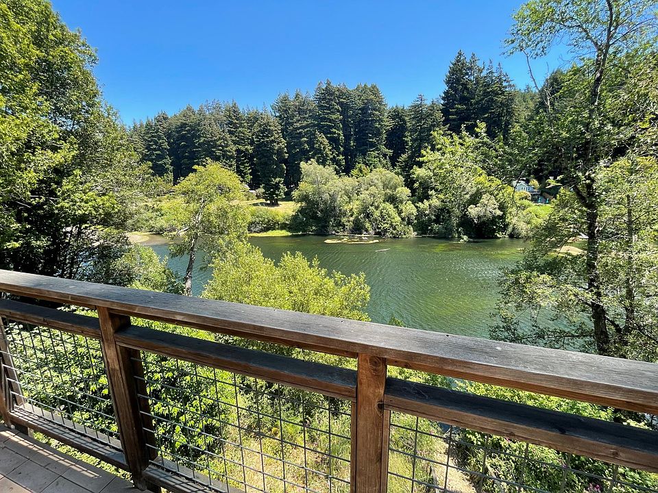 What a wonderful River Front property with stairs leading you down to your dock on the River! Home offers large square footage of living space with floor-to ceiling windows overlooking the river. 2 generous bedrooms upstairs boast large windows also overlooking the river. Wonderful rentals below for extra income or extended family. Plenty of parking. Half-acre lot includes majestic groomed redwoods, full sun, wide skies. This property has so much to offer...