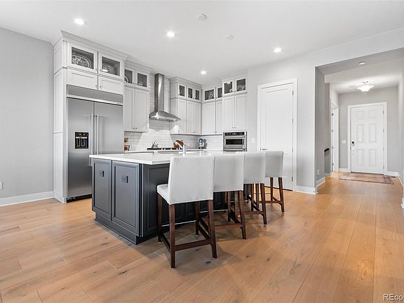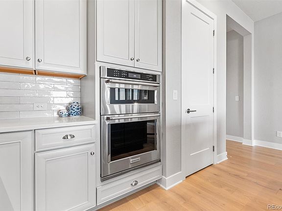 - Description: 42" White Wood Stacked Cabinets, Quartz Countertops, Oversized Center Island, Stainless Steel Appliances, Built In Kitchenaid Refrigerator And Freezer, Built-In Kitchenaid Convection Oven And Microwave Combo, Kitchenaid Dishwasher, Subway Tile Backsplash, A Walk-In Pantry, And White Oak Wood Floors