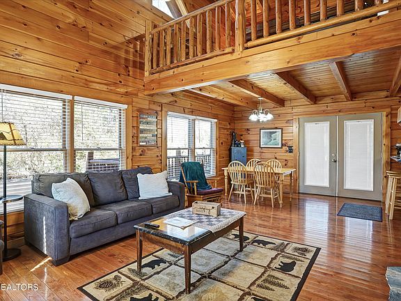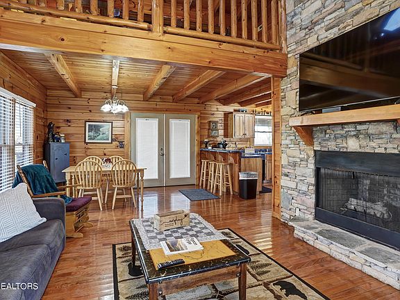 Welcome to ''Bear's Den'' - your quintessential mountain escape in the heart of Pigeon Forge, just off the bustling Parkway! This charming 2-bedroom, 2-bathroom cabin offers a cozy retreat with a rustic touch, featuring pine walls throughout, creating a warm and inviting atmosphere. As you step inside, you'll be greeted by the open concept main living area with cathedral ceilings, allowing natural light to flood the space, creating an airy and spacious feel. The centerpiece of the great room is the stacked stone gas-log fireplace, perfect for cozying up on cool mountain evenings. The kitchen seamlessly blends with the cabin's rustic aesthetic, boasting wood cabinets and an open design that encourages conversation. A convenient breakfast bar provides additional seating, making it easy to entertain while whipping up your favorite mountain cuisine. On the main level, you'll find a comfortable bedroom, providing a peaceful retreat for your guests, and a full bath with a tub-shower combo. Upstairs, a delightful loft area awaits, complete with a pool table for endless entertainment. The primary bedroom, featuring its own private ensuite, beckons with a touch of luxury, offering a whirlpool tub right in the room. Enjoy a soothing soak while gazing out at the serene surroundings. Outside is a wonderful covered deck perfect for entertaining or relaxing in the hot tub on the cool mountain evenings! Bear's Den is not only your personal oasis but also a fantastic opportunity for a vacation rental. Its superb location offers super convenient access to The Island, the exhilarating Dollywood theme park, and the Parkway making it an ideal choice for those seeking an unforgettable mountain getaway. Embrace the charm, comfort, and adventure that Bear's Den has to offer. This cabin is ready to be your gateway to the Smoky Mountains and all the memories waiting to be made. Call today to schedule your showing!