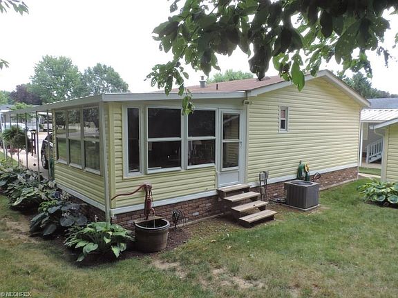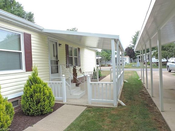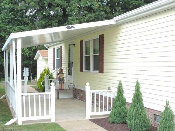 What a great opportunity to be in Navarre Village. Very nice doublewide mobile home w/Master Suite with wooded backyard views. 3 bedrooms, 2 baths. Roof, siding, spouting new in 2004. Windows all new. Closed in patio. Carport, covered front porch, storage shed. Ready to move in. Neighborhood Description Navarre Village is a congenial neighborhood community where everyone is assured the quiet life with privacy and peaceful living. Our 243 home sites is a land lease 55 and Over Manufactured Home Community that features well maintained spacious yards, beautiful shade and ornamental trees, individual mailboxes at the home sites, paved asphalt streets, an RV lot and underground utilities. Each home site has metered gas and electric.No Frames For our residents' convenience, Navarre Village is located 5 miles south of Massillon and 1 mile south of Route 30; just minutes from the Massillon Wal-Mart Center and Menards. The Navarre YMCA is 1/2 mile east of the Community.Navarre Village was established in 1973 and thirty-eight years later it is still family owned and operated!