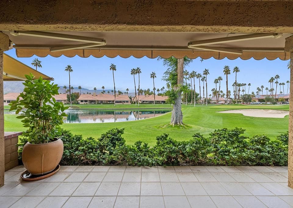 Nicely upgraded 2/2 featuring wood plank style flooring, granite kitchen with pull-out drawers and stainless appliances. VIEW VIEW VIEW - overlooking the 9th green and large water fountain and spectacular snow-capped mountain views! The extended tiled patio with pony wall also has a glass block privacy wall and motorized awning. This home has just been freshly painted throughout. Bathrooms are remodeled with granite countertops. Windows have been changed out to dual pane and the AC is less than 5 years old. Nice, clean finished garage! Partially furnished too!