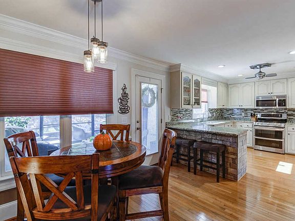 - RoomKitchenFeatures: Granite Counters, Eat-in Kitchen, Floors-Hardwood, Cabinets-Stained, Backsplash-Tiled, Counter Tops-Solid Surfac