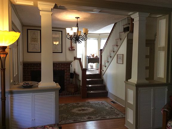 A charming Victorian home where modern function meets 1890s opulence. Classic features with brick front, large wrap around covered porch, wood floors, oversized molding, columns, storage nooks, and pocket doors. Modern updates include central air, dual zoned program thermostat, vinyl siding, updated electric, Pella windows, recessed lights, ceiling fans, renovated full bath with oversized tiled shower with glass doors tile floor. Enter into a welcoming foyer with brick wood burning fireplace, wide molding on columns, beautiful stairs with bay window new carpet with orig wood floor continues thru the hall. A traditional Living Rm with wood floor, storage nooks, bay windows with shutters and pocket doors into Dining Rm. Spacious Kitchen with tile floor, backsplash and counter, large island, floor to ceiling cabinets with a corner hideaway. The Lshaped counter is perfect for entertaining. Large Family Rm full of windows, dual ceiling fans, another front door entrance, French doors to the backyard. A main floor Laundry and Half Bath with tile floor. Cozy BedRms with wood floors, walkup 3rd flr attic converted to a bedrm and storage rm. Full basement with bilco doors. The fenced backyard is truly a personal oasis, including multi entertainment areas on a paver patio, hot tub, private beach bar, oversized 2-car detached garage with storage rm, nicely landscaped. Appraisal completed prior to Listing. Previous offer fell through. USDA Inspection completed and repairs were made. Quick settlement possible.
