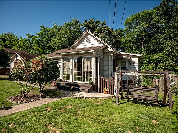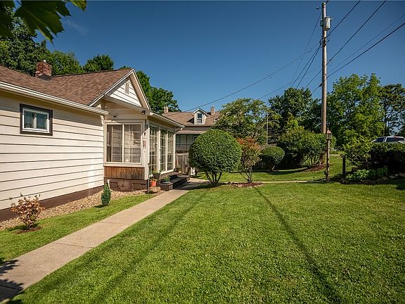 It features an updated eat-in kitchen with appliances, 2 bedrooms, living room and an enclosed front porch. Partially finished basement hosts a family/game room, possible 3rd bedroom and a 1/2 bath. No parking problems with a detached garage with additional off-street parking spots. A walk-out basement leads to a fenced in private back yard overlooking the Connoquenessing Creek. Newer roof, windows, furnace , hot water tank, french drains and gas lines.This home welcomes your arrival!