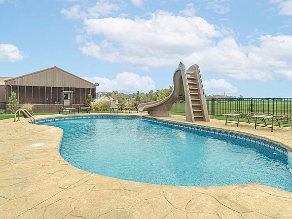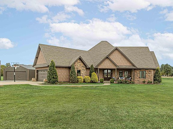 Exquisite 3-acre estate with a luxurious 3-bedroom home, pool, and versatile amenities. Discover private living within this exceptional estate nestled in NE Arkansas. The main house, a meticulously designed 2128 sq ft residence, boasts 3 bedrooms and 2.5 baths. This property goes beyond the ordinary with additional amenities that elevate it to a league of its own. The main house offers a spacious and open floor plan with stained concrete floors, a stone fireplace, and rich walnut-stained built-ins. In fact, you'll see that the interior was thoughtfully designed with coordinating walnut-stained doors, walnut-stained shaker cabinets, wood dining room columns, and baseboards. The kitchen features granite counters, stainless steel appliances, pearlescent backsplash tiles, and abundant storage space perfect for any chef. The primary ensuite boasts dual vanities, a roomy walk-in closet, and a custom-tiled shower. Step outside to discover an outdoor paradise consisting of a covered patio area with a grand stone fireplace that overlooks a sparkling saltwater pool enclosed by a wrought iron fence.
