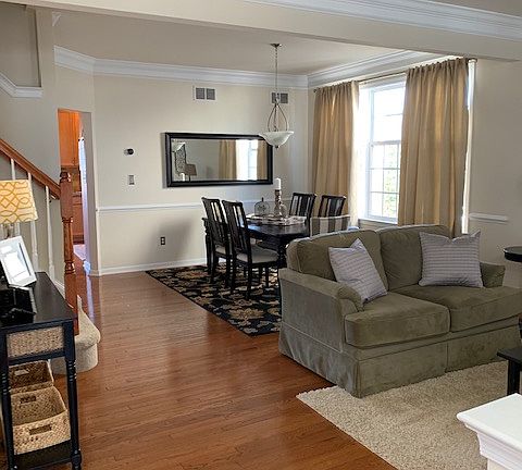 Suburban living with convenience to shopping, major highways, banking, restaurants and more. Amenities include pool, tennis courts, playground, and walking trails. This carriage house has 4 BR, 2-1/2 BA, full-unfinished bsmt., hardwood in LR & DR, crown molding, front porch, rear deck, Dual-zone heat pumps. 1-car garage, beautiful landscaping, and views of the Fall foliage in the mountains.