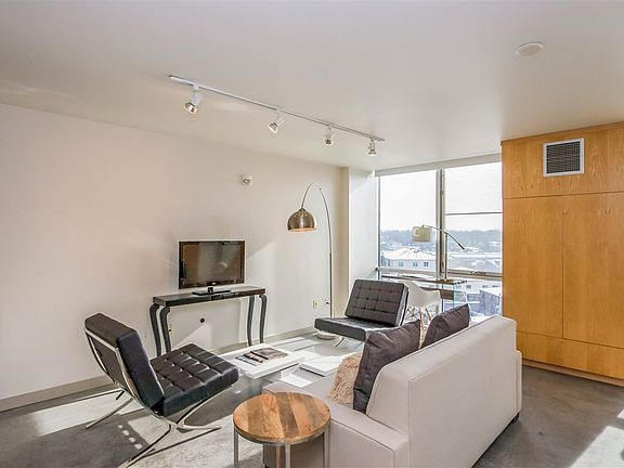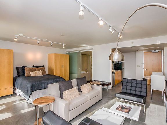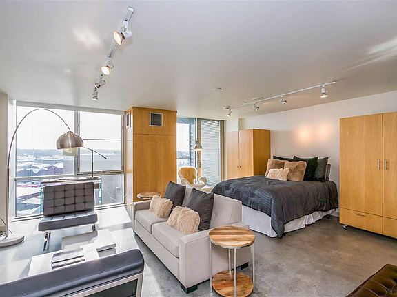 Downtown contemporary 7th-floor studio condo offers comfort, security, high views of cityscape. Open floor plan w/ natural light from SE windows. Upscale, well-managed bldg w/ front-desk, mailroom, furnished elevator lobby, 5th-floor laundry, trash/recycling area per floor, hotel for visitors, & grocery store/deli/restaurant. SS appliances, glass cooktop, maple cabinetry, 2 moveable wardrobes, Mbath: glass shower, soaking tub. Deck w/ glass wind-screen railings. One secure parking spot under. 1 bdrm, 1bth.