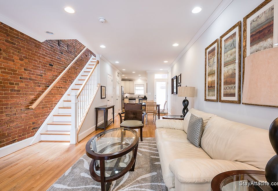 Available Aug 02, 2020. - Fully furnished completely renovated 3 bedroom, 2.5 bathroom rowhouse located in the historic neighborhood of Capitol Hill. Walking distance to the Capitol buildings, restaurants, shops, parks, museums, and Washington DC monuments and historic sights. Easy access to transportation with Union Station and the Eastern Market Metro Stations nearby. This is a two story home plus a finished basement. It has multiple skylights, high ceilings, and exposed brick walls. Stainless steel appliances and granite counter tops adorn the kitchen along with all the tools needed for cooking. The spacious living/dining area is beautifully appointed in a contemporary style. The basement, featuring a seating area and bar, leads out to a private patio with dining table and a fenced yard. As an added bonus, the deck off the living/dining room offers an additional outdoor space. The master bedroom has a queen sized bed. A full bed is in the second bedroom and a twin is in the third. There is a washer and dryer in the home. Parking is a small private garage located in the end of the back yard. Walk score: 95, Transportation score: 87, Bike score: 95. Click here to inquire about our property availability Please note: For stays shorter than 90 days there is a required 14.5% Washington, DC Hotel Tax due in addition to the rental amount.