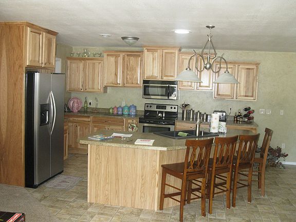 Low maintenance, energy efficient, comfortable home sitting on corner lot spreading out close to an acre with drive-up ease to front door access No Steps! Well designed kitchen with step down hickory cabinets, center island, roll out drawers and roomy Pantry for all the extra storage. Dining area open to living area. The skylights bring beautiful light into the home. Larger bedrooms with expansive master suite including 2- walk in closets, garden whirlpool tub, shower, and double sinks. Relax on the front patio perfect for outdoor entertaining. The energy efficiency of the home is bar none an economic feature for $$$ savings. The property has a detached 2 car 32x28 garage with bonus room (16x32) above that accesses the upper property where the huge 30X50 shop is located. The shop door is 14’W by 12’ H . Park your Rv right inside!