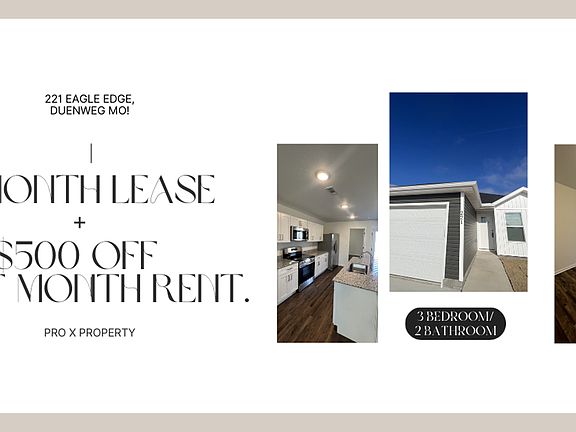 SPECIAL: 6 MONTH LEASE + 500 OFF FIRST MONTH RENT!! YOU DO NOT WANT TO MISS OUT ON THIS. Welcome to your newly build 3 bedroom/ 2 bathroom house in Duenweg Mo! As soon as you walk in this home you get a open floor plan. The Kitchen has stainless steal appliances: stove, microwave, dishwasher, and fridge! All Hard floor , No carpet!! This home has a 2 car garage and Laundry hook ups! Come View this today, and make this your new place to call home! pets allowed (2) Max! $250.00 one time non refundable pet fee and 50.00 monthly pet rent. Our office requires an approved rental application before we can lease a property. The application is on our website and is $40 to apply. *Please be aware of scams! We do not take cash, we will never ask you to leave money at a property, we only accept payment AFTER an application has been approved. We do not accept Venmo, Cashapp, or any other payment service such as those.* All Pro X Property Management residents are enrolled in the Resident Benefits Package (RBP) for $40.00/month which includes renters' insurance, HVAC air filter delivery (for applicable properties), credit building to help boost your credit score with timely rent payments, $1M Identity Protection, our best-in-class resident rewards program, and much more! Renter's insurance is a requirement to rent from Pro X. This helps protect your items in an unfortunate situation! Deposit Installment Program: Pro X is now offering a Deposit Installment Program for eligible residents. The program allows residents to finance the total deposit over a 12-month lease. We know moving can be expensive. We want to help eliminate some of the burden. There is a $20 monthly administration fee for this program. Deposit charge is payable with the monthly rent amount and is subject to late fees. We are excited to welcome you home!