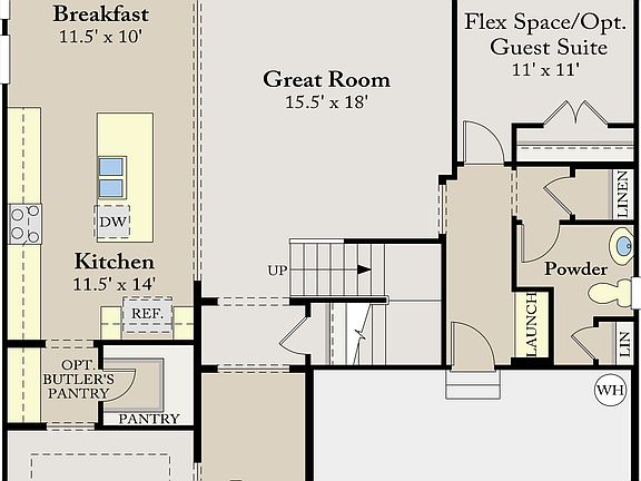 The Pemberton's design opens to a spacious Great Room, which can accommodate a fireplace, and which flows seamlessly to the breakfast nook and island kitchen. The casual dining room can be expanded, while a patio/deck can be added from there. Kitchen appointments include maple cabinetry, granite countertops, and Whirlpool appliances, with an optional butler's pantry leading to the formal dining room. Also on the first floor of the 2,976- to 3,440-square-foot home, a flex room with a powder room can be converted to a guest suite with full bath. The design's flexibility offers 2.5 to five baths and four to six bedrooms, with the upstairs loft adaptable to a bedroom. The sumptuous owner's suite upstairs boasts separate walk-in closets, a garden tub, tiled shower and cultured marble vanities. Add a second-floor staircase to an optional storage space.