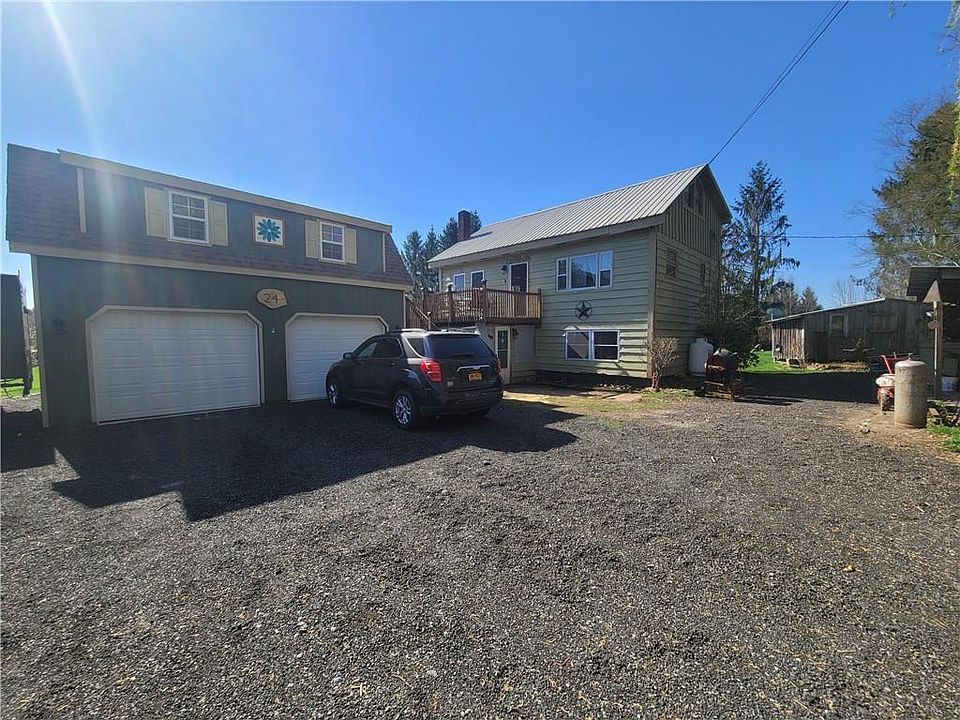 Contemporary style home on 1.57 level acres with 24x24 two car garage with craft room upstairs in the town of Neversink. Vaulted ceilings with exposed wood beams in the living room and dining area, country kitchen with wood cabinets and window overlooking the back yard. Full bathroom on the main level, access to large loft area with half bathroom upstairs. Finished walkout lower level, features wood stove along with laundry area, second full bathroom and a second bedroom. Your land is set up fruit trees, gardens, outbuildings which can be used for chickens or other animals. Town of neversink means LOW TAXES Additional Information: HeatingFuel:Oil Above Ground,ParkingFeatures:2 Car Detached,