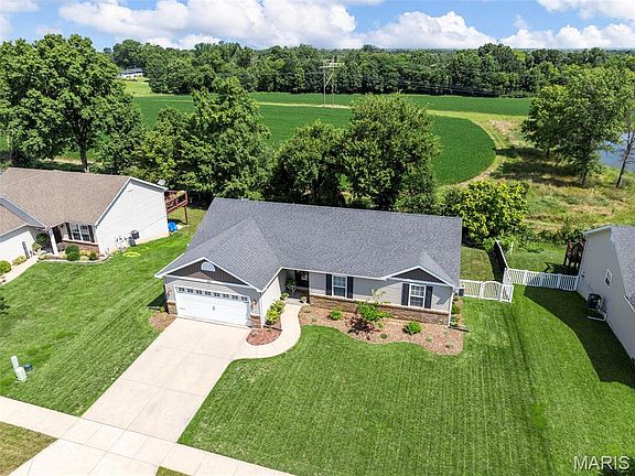 Welcome to your dream ranch retreat. Nestled on a peaceful lot backing to open farmland, this beautifully maintained 4 bed 2.5 bath home offers the perfect blend of country living with convenience of being just minutes from Wentzville! Step inside to find LVP flooring, spacious great room, vaulted ceilings and a cozy fireplace. The open kitchen and dining area flow seamlessly for entertaining and the elegant tray ceilings add a custom touch. The main floor laundry is conveniently located right off the kitchen. The primary bedroom has a tray ceiling and an en suite bathroom with a walk-in shower and plenty of counter space. Step out on to the 1 year young beautiful deck to enjoy peaceful sunsets over a view of farmlands. The fully finished lower level offers a generous second living space, complete with a wet bar, half bathroom and the 4th bedroom. Did I mention the pool table stays too! With a 2-car garage, fully fenced yard, plenty of updates, and room to roam, this is a rare opportunity to enjoy tranquil rural vibes without giving up city access.