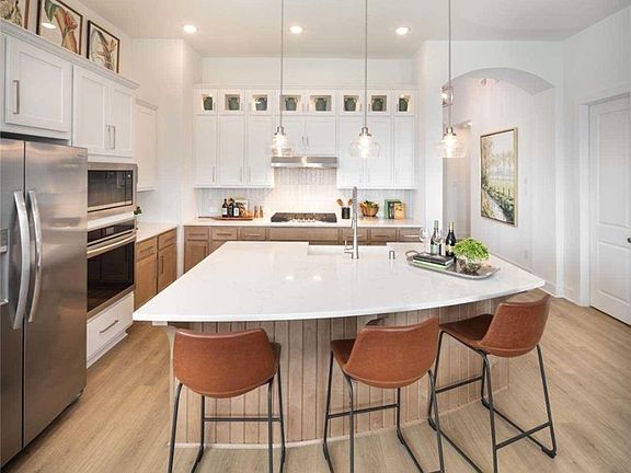 MLS# 504445 - Built by Highland Homes - Ready now! ~ This stunning single story is a MUST SEE! With 12-foot ceilings and 8' doors, the home presents an open living space with well-appointed designer selections throughout the home. The kitchen stands out with its two-tone cabinetry, featuring 15 uppers with glass inserts and decorative bead-board island. A pot-pan drawer is conveniently located under the 36 built in cooktop for additional storage. The primary bedroom includes a bay window, which not only enhances the exterior aesthetics but also creates a cozy and inviting space inside. The primary bathroom features an oversize shower, providing a luxurious spa experience. To add to the layout, an additional room has been added, serving as an entertainment room. This space can be customized to suit your preferences, whether you want a dedicated home theater, a game room, or a versatile space, this home has it all!