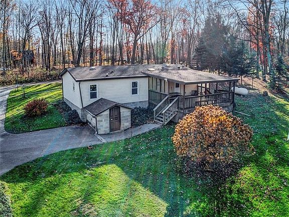 Peace and tranquility abound in this 5 bedrooms, 2 bath home on 2.66 acres. Sit on your covered back deck surrounded by wooded beauty and all the wildlife around there. Open feeling with skylight in the vaulted ceiling living room with a fireplace. The owner uses a pellet stove instead of a fireplace. Dining Room and kitchen combo with a pantry, dishwasher, and refrigerator. The laundry room off the kitchen is so nice. Nice size master and large master bath with a whirlpool - like tub. The basement has 2 more bedrooms. One currently a sewing room. Plenty of privacy in this home. Property has a large 2 car garage with an addition for your toys. 2 Sheds for storage, and a fire pit. The property has a water treatment system. Sump Pump and french drains. Roof replaced 2015. Newer siding on house and garage, newer furnace/a/c Gutter Helmet and ice guard &drip edge. All this tucked in the woods, yet close to shopping,and university,