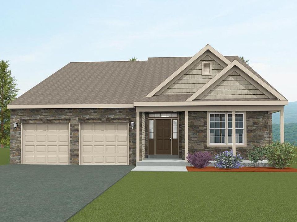 Welcome home to the Lydia on Lot 49 at McIntosh Farms II with a highly anticipated availability in late summer 2023! Ledgestone accents along the front exterior paired with vinyl shakes in the double gable and insulated carriage doors just scream curb appeal with these breathtaking exterior selections! The large inviting front porch leads you directly into a large formal foyer with two bedrooms tucked to the side, creating a split bedroom design, perfect for guests and family.