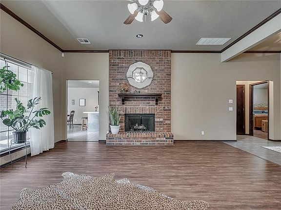 This beautiful spacious home in Edmond offers 3 bedrooms, 2 bathrooms, 2 living rooms, 2 fireplaces and a shop. Enter into a beautiful formal living room with a gas fireplace so much natural light throughout with gorgeous windows. Split floor plan with the main bedroom having vaulted ceilings, plantation shutters, large bathroom with 2 skylights and a walk in closet. The kitchen and dining area offers plenty of space and opens to the 2nd living room which is spacious, has built ins and a fireplace. Enter into the backyard which has a nice large covered patio, the shop sits on a slab, approx 10x17. 6' roll up door, fully insulated and decked and the property backs up to a green belt. This home also has a sprinkler system.