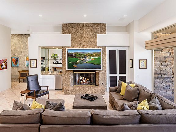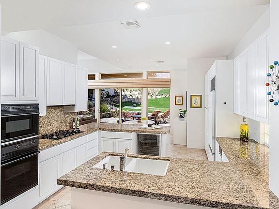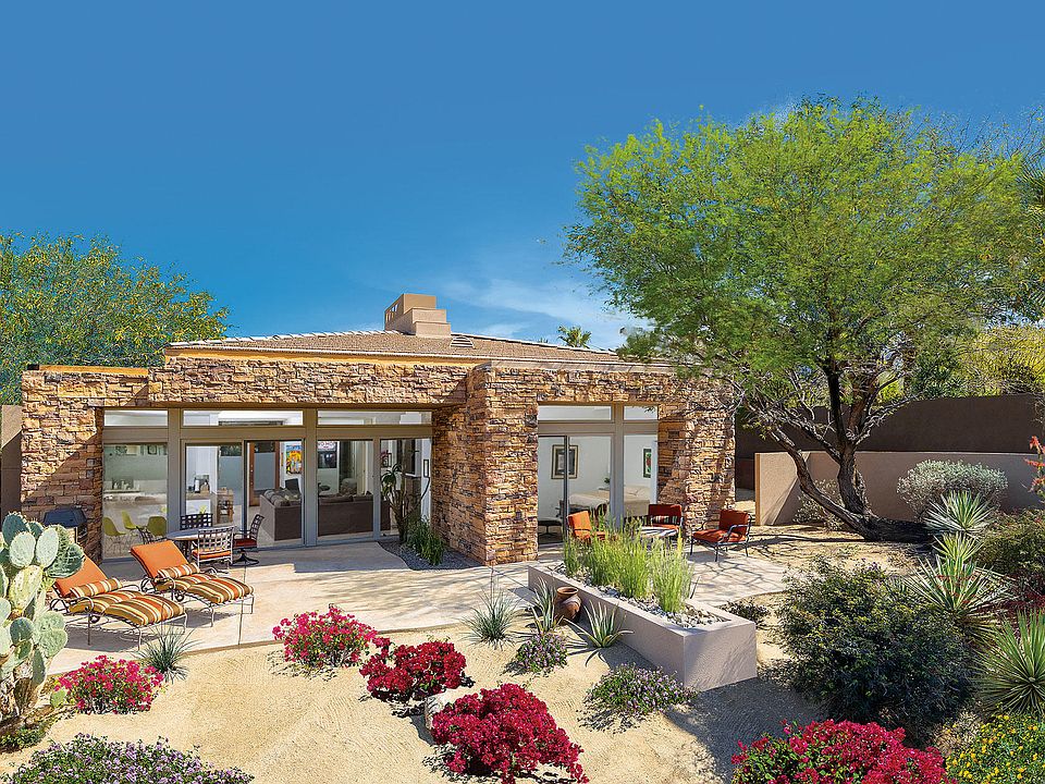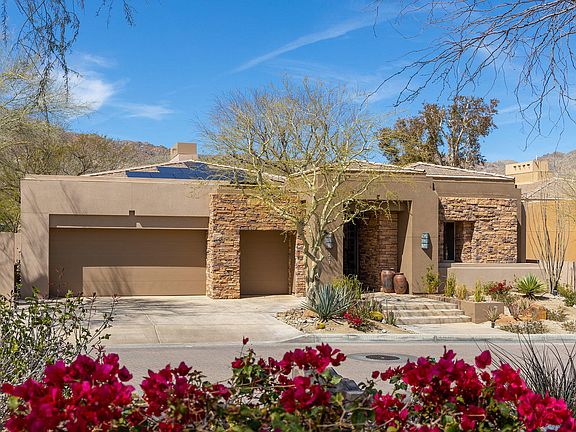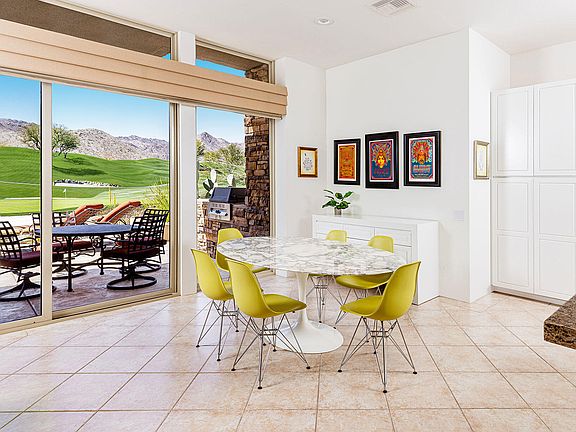 If you're looking for easy, lakefront living, this is for you. Unobstructed mountain, golf course and lake views from this three-bedroom home with high ceilings, open floor plan and sliding glass doors out to the patio from the great room, dining and master suite. Light and bright with LED Lutron lighting system and updated A/V. Terrific proximity to the Clubhouse and Spa & Wellness for BIGHORN members. Large walled side yard within a private easement can be landscaped, making a great dog-run, patio or gardens; west patio offers room for a spa or small pool. Generous detached guest house with entrance off courtyard. Two-car plus golf cart garage. Owned solar.
