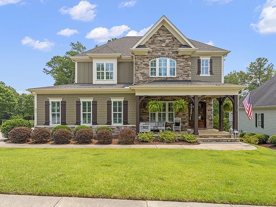 Beautiful custom built home in prestigious 12 Oaks Community boasts 5 bedrooms, 5 full baths with well-appointed finishes throughout. 10 foot ceilings on the main level, formal dining room, large open floor plan with stone fireplace, expansive eat-in kitchen island, and custom floor to ceiling cabinetry.  Gorgeous back porch with vaulted ceiling overlooking private wooded backyard. Guest room on main level with full bath. The basement has a bonus room, bar, theater room, full bath and ample storage.  This .43 acre lot comes with an outdoor living space, stone patio with fireplace, grill, and firepit perfect for year round outdoor living.  Both the grill and fireplace have direct gas hookups.  This pristine home is fully landscaped with custom outdoor lighting, heat tolerant Zoysia grass and is impeccably maintained.  There are a plethora of neighborhood amenities including a private clubhouse with restaurant, bar, poolside pub, various activities for all generations, 3 large pools, splash pad, water slide, tennis and pickleball courts, playground, dog park, and miles of walking trails.  Schedule your tour today!