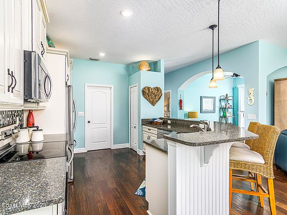 Immaculate move in ready 3 bedroom 2 bath pool home located in the beachside gated community of Oceanside Village where you will find this home to be the perfect beach side oasis. Oceanside Village boasts it's own tennis court, community pool, club house and is only a 5 minute walk to the beaches and shopping. Pride in ownership shows throughout this pristine home with a beautiful oversized outdoor screened in lagoon style pool with ambient lighting. Both full size bathrooms have been remodeled with quartz and raised countertops. The kitchen remodel consists of quartz countertops, stainless steel appliances, soft close cabinets and more. The roof was replaced 5 years ago and HVAC is 2 years old, pool screen replaced in 2021. The home shows like a model.
