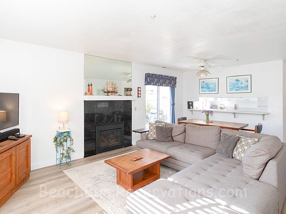 A Pismo Beach classic beach vacation is yours in this two bedroom, two bath condo. This spacious condo is in a wonderful downtown Pismo location just one block from the beach, boardwalk, and pier - and walking distance to to all downtown Pismo Beach has to offer. If you rather stay in and cook there is a big dining room area with plenty of seating and a big back yard if you want to barbecue. The living room is furnished with a comfortable queen size sleeper sectional, a flat screen tv, and a warm gas fireplace. The en suite master bedroom has a king size bed, jacuzzi tub shower, and its own private patio. The second bedroom has a queen size bed and is situated adjacent to a second full bath. The washer and dryer is located in the hall utility closet. Utilities are included in the rent for your convenience. Please note that additional cleaning fees will apply, please contact us for more information.