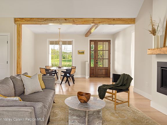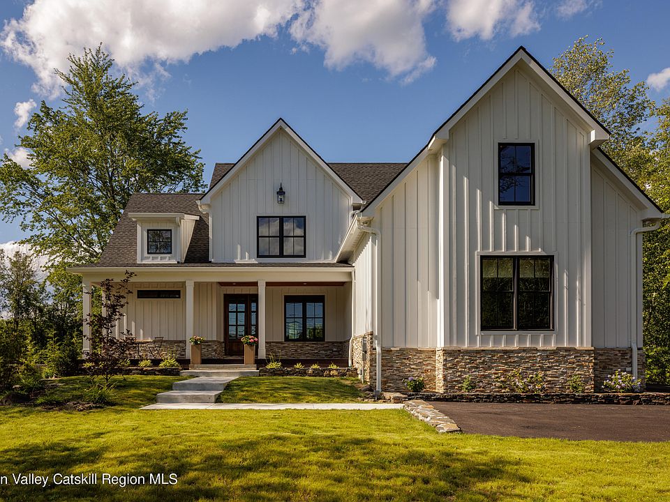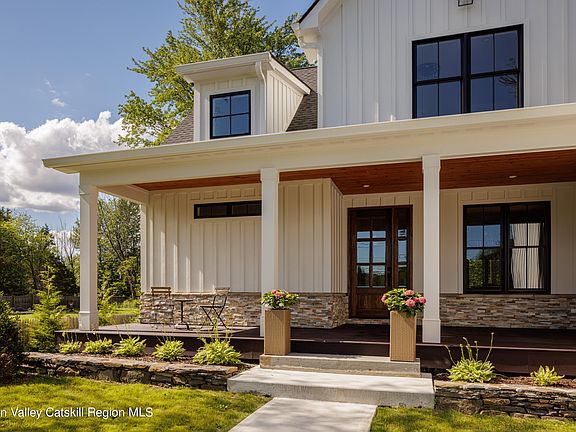 Be the first to occupy this brand new contemporary farmhouse perfectly located in the heart of Rhinebeck. Enjoy village life at your doorstep! Less than a mile away you'll find charming shops, delicious restaurants and the best the village has to offer - from the bustling farmer's market to the quiet library and refreshing community pool, as well as easy access to the Rhinecliff Train Station. The spacious 2,496 sq ft layout, designed for modern living, offers a perfect blend of style and functionality. Vaulted ceilings and expansive windows create a light and airy feel throughout the home. The chef's kitchen with a large island, perfect for entertaining, opens to the warm and inviting living room with a fireplace and dining room. The luxurious first-floor primary suite features a walk-in closet with window and a spa-like bathroom that includes a soaking tub, walk-in shower and double vanity. Upstairs, two additional bedrooms (one ensuite) and a den provide ample space for family or guests. A mudroom with laundry, in addition to a powder room just off the kitchen and with quick access to the attached 2-car garage, makes for easy living. Enjoy 6-inch solid oak hardwood and tile flooring throughout as well as custom woodwork milled from trees felled on the property. Relax and unwind on the expansive 57-foot covered porch with Trex decking. The flat, half-acre yard is perfect for a garden or play-set. The unfinished 1,564 sq ft basement boasts high ceilings and offers endless possibilities. Transform it into a media room, home gym, playroom, or additional office space - the choice is yours!