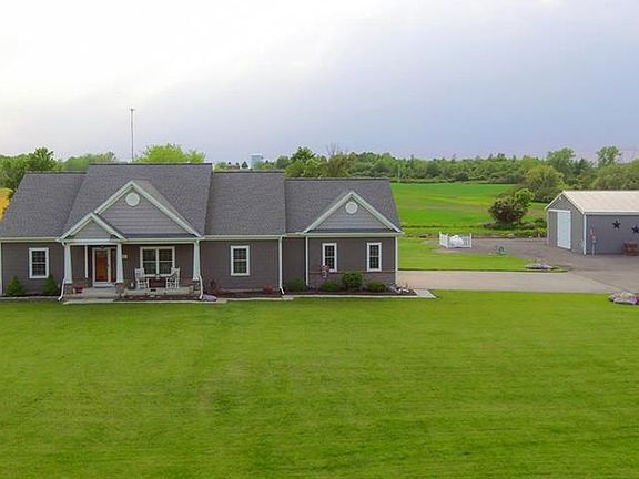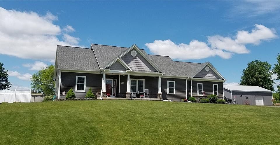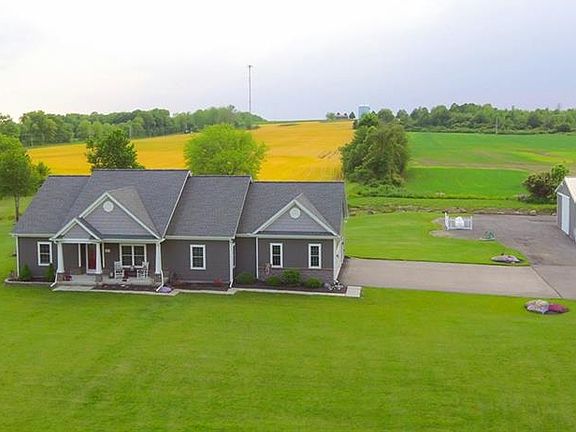 Beautiful Custom Built 2011, Ranch w/ over 1900SF on 5+ Acres! Open Floor plan! Kitchen w/ tall cabinets, silent close drawers, granite countertops, walk-in pantry & 2nd pantry. Kitchen opens to Dinette & large fireplaced living room. Patio Doors to Sun Room w/ 4 Sliding Glass Doors to patio & pool area w/ decking. Cherry Floors & Oak Floors! Master Suite, 2 Lg bedrooms & 2 full baths! 1st Floor laundry, C/A & much more! Full Basement w/ Egress window! Approx 35x55' Barn w/ 12' 1/2" Door & overhead Door. Public water. Could separate possibly some land for Building Lot. Close access to 490 too.
