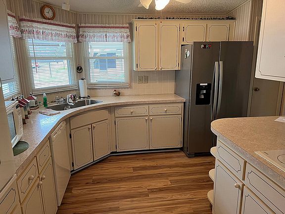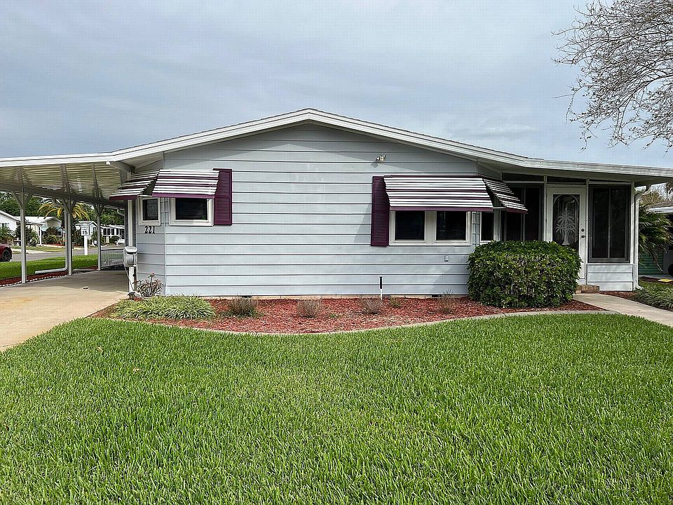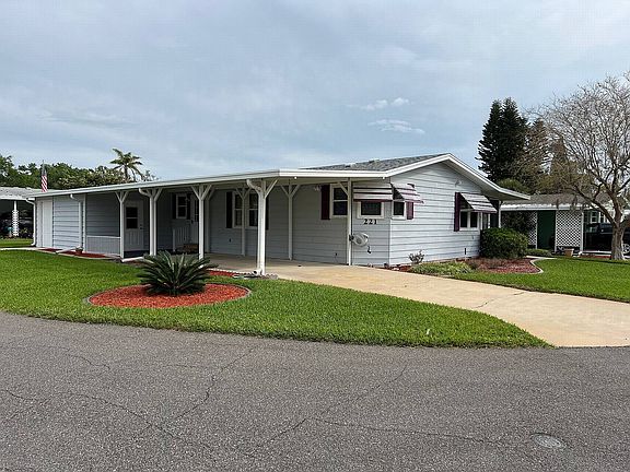 Nice 2 bed 2 bath home has newer double pane tilt windows and newly remodeled bathrooms as well as newer carpet throughout. Roof and carport were replaced in 2016 and water heater in 2022. The shed has a separate door perfect for a golf cart and plenty of room for more storage. Large kitchen with plenty of storage, dining room has a nice buffet. Inside laundry and office space. Florida room is heated and air conditioned. All appliances included.