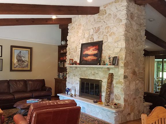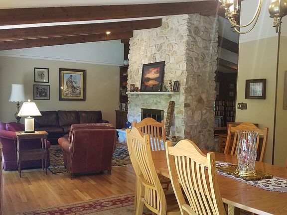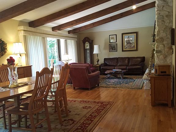 Peaceful, park like setting is perfect for this quality built home. Large, open spaces with cathedral ceilings, beams and spectacular 2 sided, floor to ceiling, stone fireplace. Balcony across the front of the house with 3 sets of sliding doors. 2 brick patios. Master suite with full bath. Large sun room on back of the house. Newer hardwood floors in living, dining and family room. Lower level has additional family room with brick 2 sided fireplace, a bedroom and a full bathroom. Must see to truly appreciate the magnificent structure.