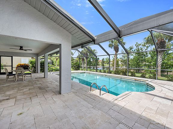 Dreaming of bundled golf and tranquil lake views from your own private pool? This fully remodeled three-bedroom, two-bath home in Countryside Golf & Country Club has it all, including full golf membership and western exposure for stunning sunsets. Step inside to soaring cathedral ceilings with recessed lighting and luxurious vinyl plank flooring that runs seamlessly throughout the home. The new kitchen showcases white shaker-style cabinetry, quartz countertops with a dramatic waterfall edge, a spacious four-seater center island, and high-end stainless steel appliances. Natural light floods the adjacent, open-concept dining and living areas from two glass sliders, creating a seamless indoor-outdoor connection ideal for entertaining. The screened lanai features a spacious covered area for sitting and dining, a pool wrapped in travertine flooring, and private lake views for unwinding and hosting guests. The owner's suite is a relaxing retreat with private lanai access, a walk-in closet with custom built-ins, and a spa-like ensuite bath featuring dual quartz vanities, a walk-in shower with floor-to-ceiling tile, bench, niche, and frameless glass enclosure. Two guest bedrooms, both with charming bay windows, share a beautifully finished bathroom with a frameless glass walk-in shower. A well-appointed laundry room includes a washer and dryer, overhead cabinetry, and a large storage closet with built-in shelving. Countryside offers a newly renovated clubhouse experience coming in July, with resort-style pool, outdoor dining, a circular bar, fire pits, tiki bar, and casual social spaces. Residents also enjoy tennis, pickleball, fitness center with attendant, cards, concerts, field trips, themed events, and more. With close proximity to Naples' white sand beaches, 5th Avenue South, and the Gulf, this home offers the best of the Naples lifestyle.