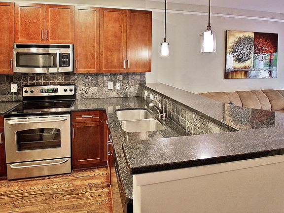 • Kitchen Features: Breakfast Bar, Cabinets Stain, View to Family Room, Stone Counters