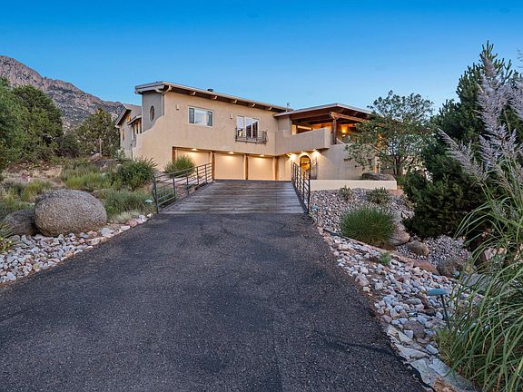 Welcome to this remarkable home that offers stunning views of the majestic Sandia Mountains, West Mesa sunsets, and the captivating city lights of Albuquerque. Step onto the expansive wraparound balcony or relax on the inviting pool deck, surrounded by the ultimate luxury of the great outdoors, fostering relaxation and entertainment. This extraordinary home is perfect for multi-generational or income generating purposes. You'll find a collection of features that epitomize the pinnacle of luxury living. Discover a hidden room with a safe, providing both security and convenience for your valuables and personal belongings. The interior showcases elegant brick floors that add a touch of rustic charm to the design aesthetic.