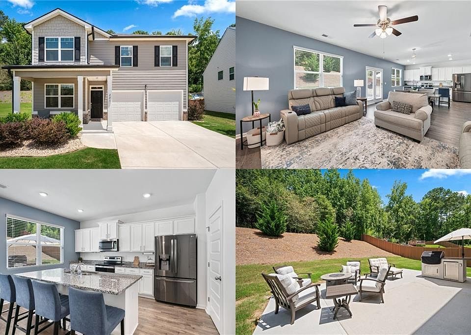 Welcome to Hampton—a thoughtfully upgraded Smart Home nestled in the sought-after Henry County School District, where modern comfort meets classic elegance. From the inviting covered front porch to the flexible front room perfect for a home office or cozy retreat, every detail has been designed with livability in mind. The heart of the home is the stunning kitchen, featuring a large granite island, stainless steel appliances, and an open-concept layout that flows seamlessly into the breakfast area and spacious family room—ideal for everyday moments and memorable gatherings. Upstairs, unwind in the luxurious owner’s suite complete with a spa-like shower and generous walk-in closet. Three additional bedrooms, a central loft, and thoughtful touches like custom closet systems and built-in shelving in the laundry room offer both space and functionality. The garage impresses with sleek epoxy flooring and custom cabinetry, while the extended concrete patio invites you to enjoy outdoor dining and relaxation. Conveniently located near Tanger Outlets, EchoPark Speedway, and a variety of shopping and entertainment options, Hampton isn’t just a home—it’s a lifestyle of comfort, style, and smart living.