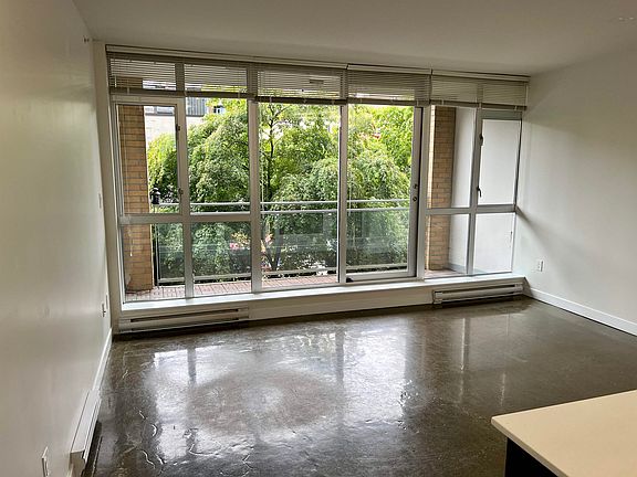 MODERN LOFT STYLE living in one of the trendiest neighbourhoods in the city. Walk through to soaring high ceilings, floor to ceiling windows, polished concrete floors, plenty of insuite storage and insuite laundry. Open concept living w/ a sliding wall system that reveals the separate bedroom + double closet. Enjoy the quietness of the private patio with its North facing view that spans the width of the unit. Perfect location in Vancouver's most vibrant neighbourhood w/ St.Paul's Hospital development combined w/ city recc. removal of the Viaducts & revitalization will add even MORE value to this sought-after area. 1 parking and 1 storage locker! RENTALS ALLOWED. Freshly painted! Perfect for First-time home buyers or an investment! MOVE IN READY!