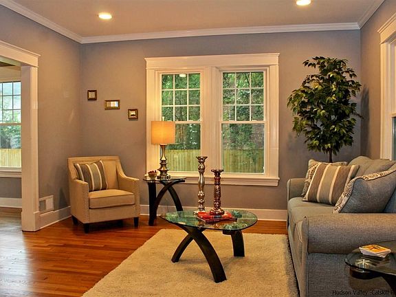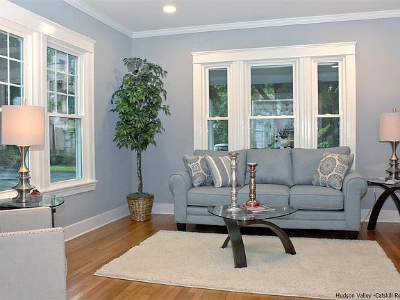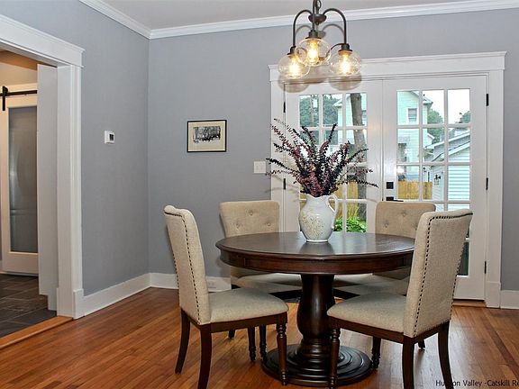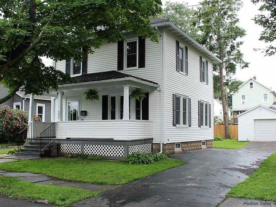 Seller is motivated and says please present offers! Located on one of Kingston's most beautiful cul-de-sac streets, this beautifully renovated home is within walking distance of the Rondout Waterfront and a short commute to the Kingston-Rhinecliff Bridge. A breezy rocking chair front porch opens into a large, welcoming entry with beautiful porcelain tiled floors and handsome refurbished staircase. With a surprisingly open floor plan, the formal living room is bright and airy, and flows nicely into the formal dining room and out the French doors to a sweet back yard with bluestone patio and privacy fence. The completely new cooks kitchen is also open to the dining room and is complete with stainless appliances, granite countertops, farm sink, crisp tile back splash, and custom slow close wood cabinets. Beautifully executed half bath on the main level boasts a washer/dryer and a beautiful barn style door with a modern twist. The second floor has gleaming original hardwood floors that have been painstakingly refinished and 3 bedrooms with closets outfitted with shelving systems. The full bath on the second level boasts beautiful marble-topped double vanity, subway tiled shower enclosure, deep soaking tub and lovely basket weave ceramic tile floors. The walk up attic is easy to access, great for storage, and has potential to become a meditation space or play room. Complete with off street parking and a 1 car garage. This gem is sophisticated, yet comfortable; it exudes the character and charm of its era with careful attention to modern amenities and functionality. Long list of improvements and upgrades include: New blue stone steps (exterior) front and back, New wrought iron railings (exterior, front and back and interior), All painted exterior surfaces scraped and painted, ALL new light fixtures, exterior & interior, ALL new electric including service, panel, wiring, outlets and switches, Updated plumbing, New central air conditioning unit, New furnace, All hot air ducts cleaned, New high efficiency, heat pump hot water heater, Refinished hardwood floors, upstairs & down, All new tile floors in bathrooms, entry and kitchen, COMPLETELY new kitchen, ALL new appliances, COMPLETELY new bathrooms, All fresh paint, ALL new windows, including basement, New recessed lighting outfitted with LED razor lights, New smoke & carbon monoxide detectors, ALL new door hardware, inside and out, New French doors in dining room, Refurbished 7' front door with beveled glass, New exterior door and storm door, Seal-coated driveway