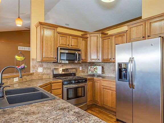 The dark wood floors and warm décor welcome you into this split bedroom ranch. All the necessary upgrades, high vaulted ceilings, dark maple cabinets, walk in pantry, main floor laundry, sprinkler and irrigation well all located on a quiet court, in the Andover school district. View-out Basement is framed for perfect floor plan layout, plus sheet rock to finish the job. Convenient location at 21st St and N Andover Rd